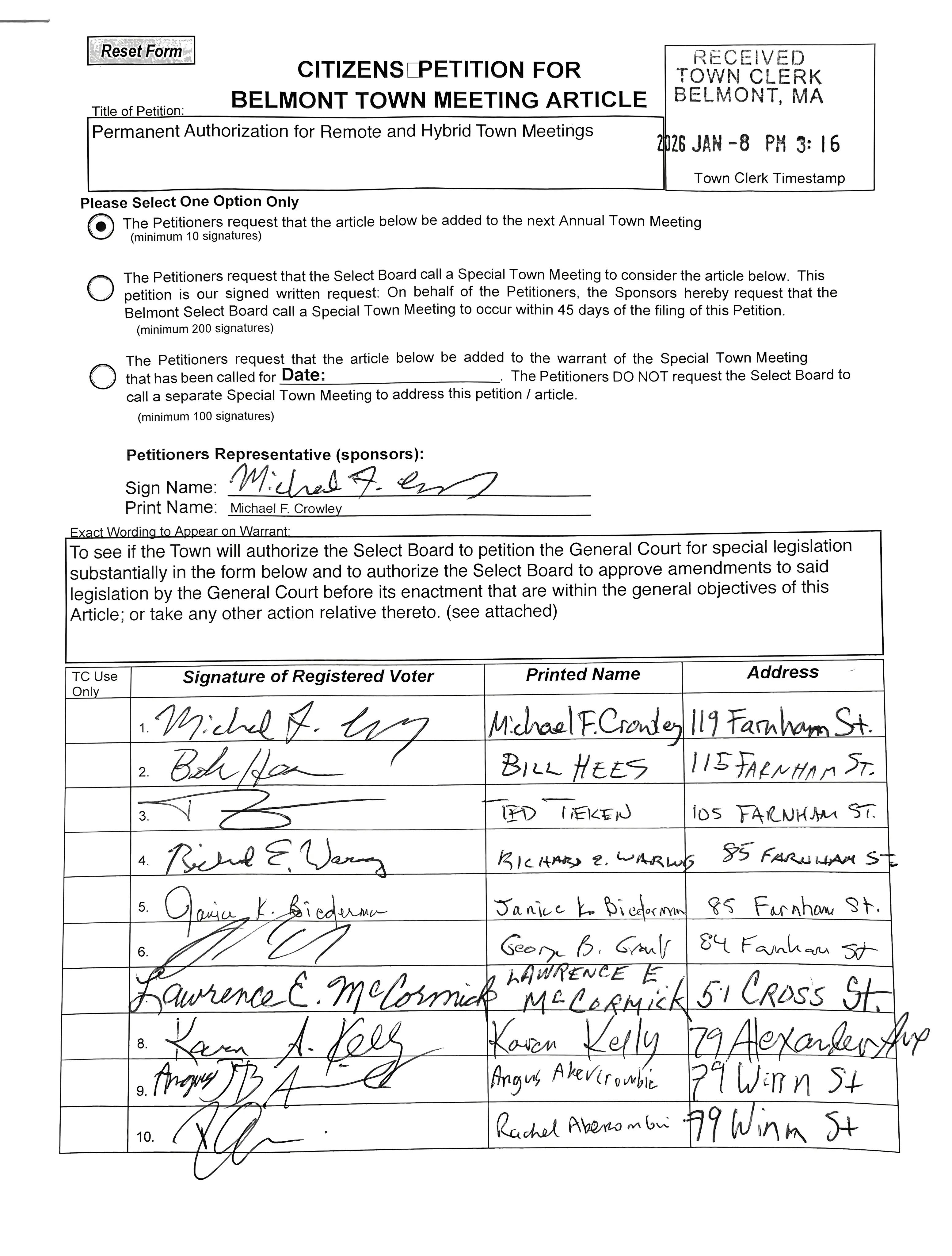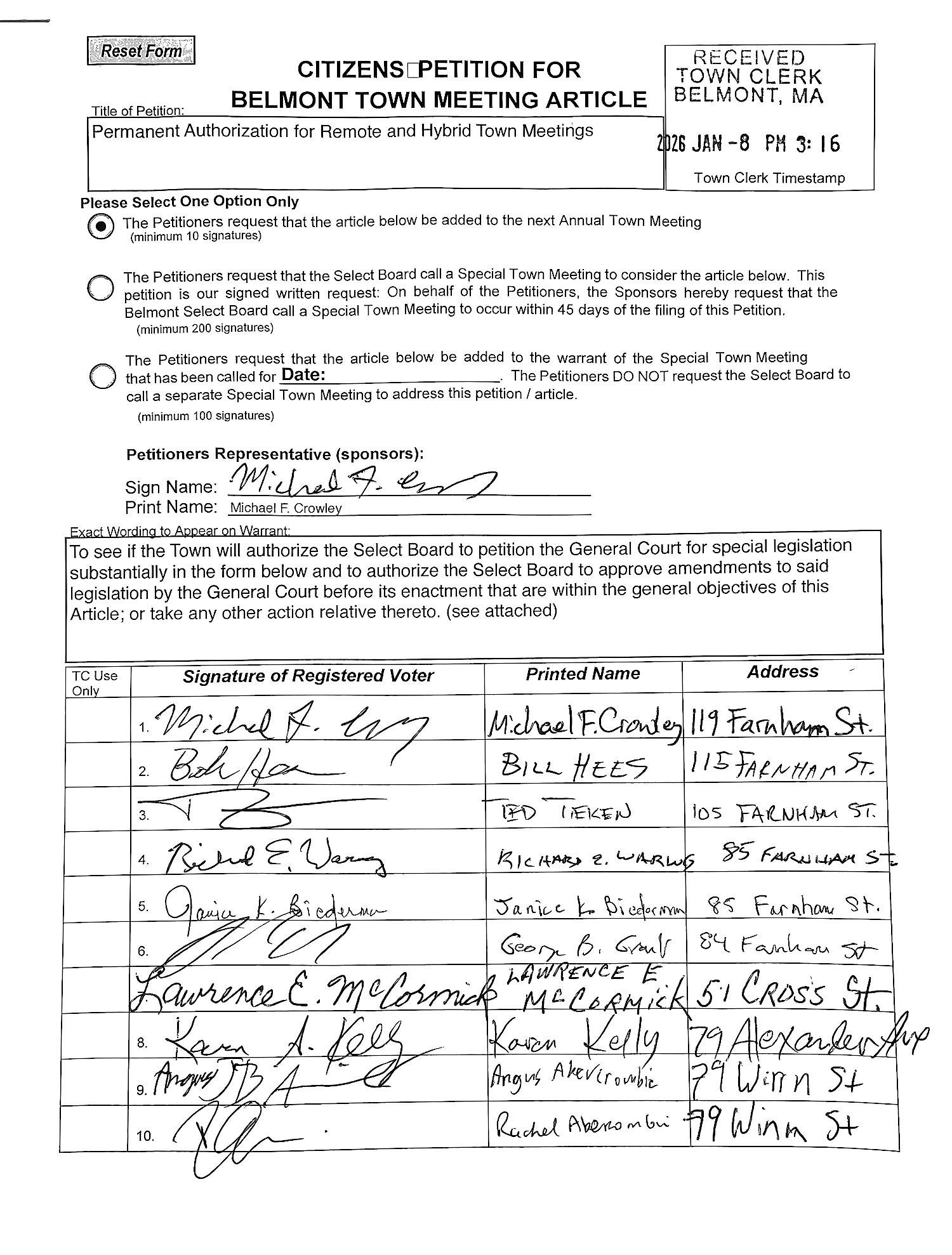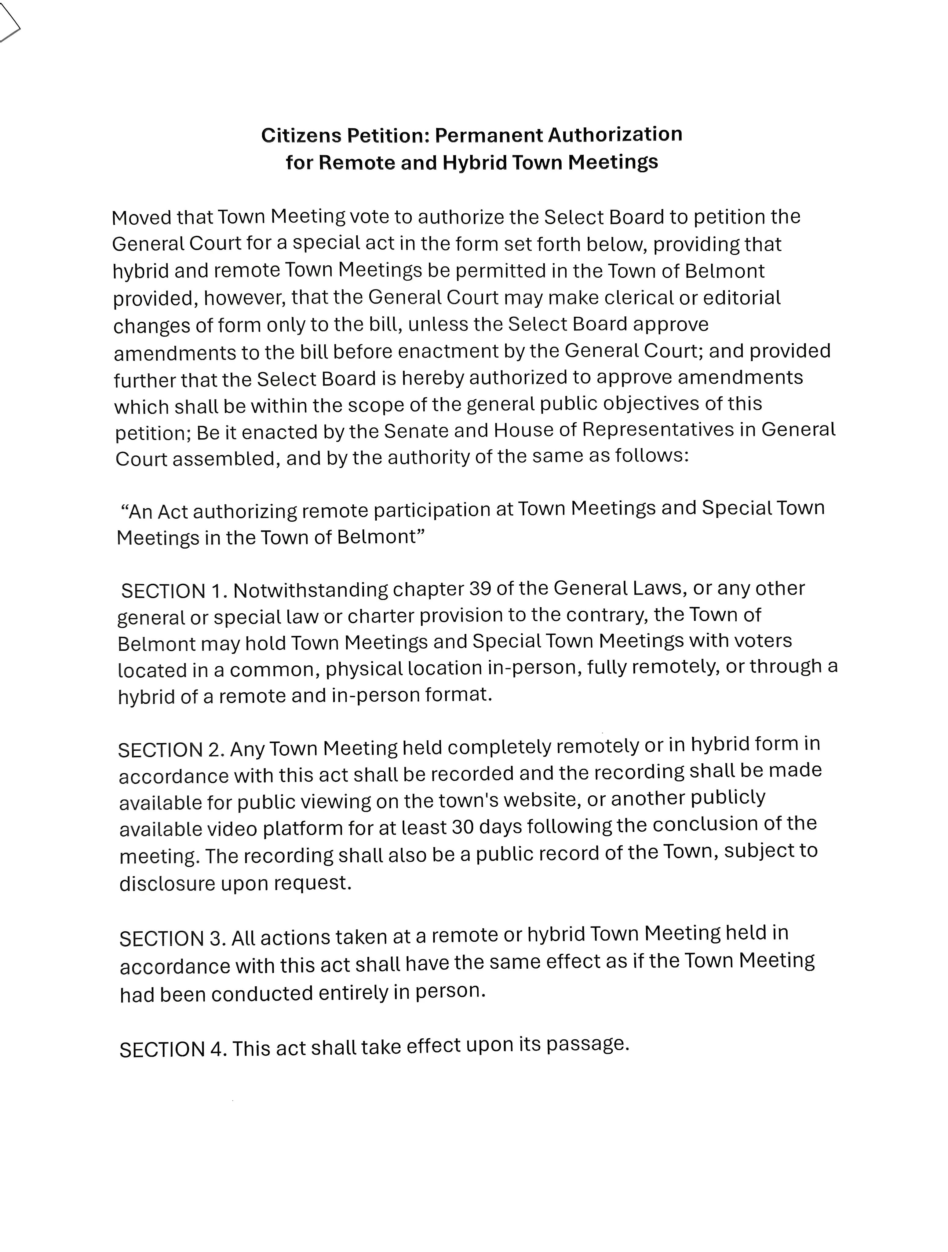 The citizen’s petition I filed for the May 2026 Annual Town Meeting has been certified. Its purpose is straightforward: to ask the Select Board to seek special legislation from the Massachusetts Legislature that would permanently authorize Belmont to hold hybrid or remote Town Meetings.